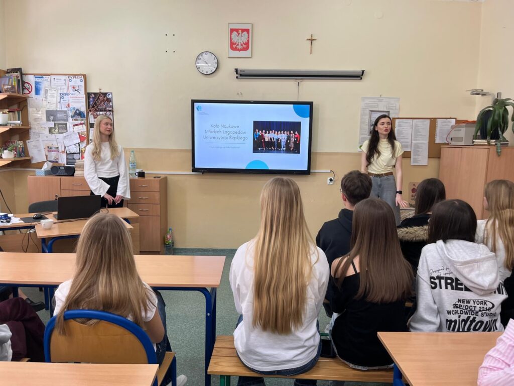 13.03.2026 roku, w ramach zajęć doradztwa zawodowego, miało miejsce spotkanie ze studentkami IV roku logopedii na Uniwersytecie Śląskim w Katowicach: p. Nikolą Konieczną (absolwentką naszej szkoły, matura 2022) i p. Julią Leonik. Podczas spotkania dowiedzieliśmy się kim jest współczesny logopeda i na czym polega jego praca. Panie opowiedziały o możliwościach rozwoju, jakie daje przynależność do Koła Naukowego Młodych Logopedów Uniwersytetu Śląskiego. Jak podkreślały, początki nie były łatwe – studia wymagają systematyczności, cierpliwości i dużego zaangażowania, ale dają ogrom satysfakcji.