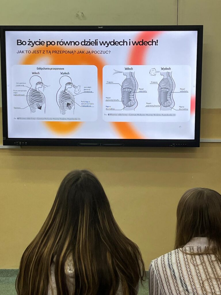 W bardzo ciekawy i przystępny sposób opowiedziała uczniom, jak dbać o głos na co dzień . Poruszyła zagadnienia związane z higieną głosu, pokazała, jak pracują fałdy głosowe oraz co wpływa na jakość i kondycję naszego głosu. Zaprezentowała również skuteczne ćwiczenia rozgrzewające i rozciągające fałdy głosowe, a także metody rehabilitacji głosu Lax Vox.