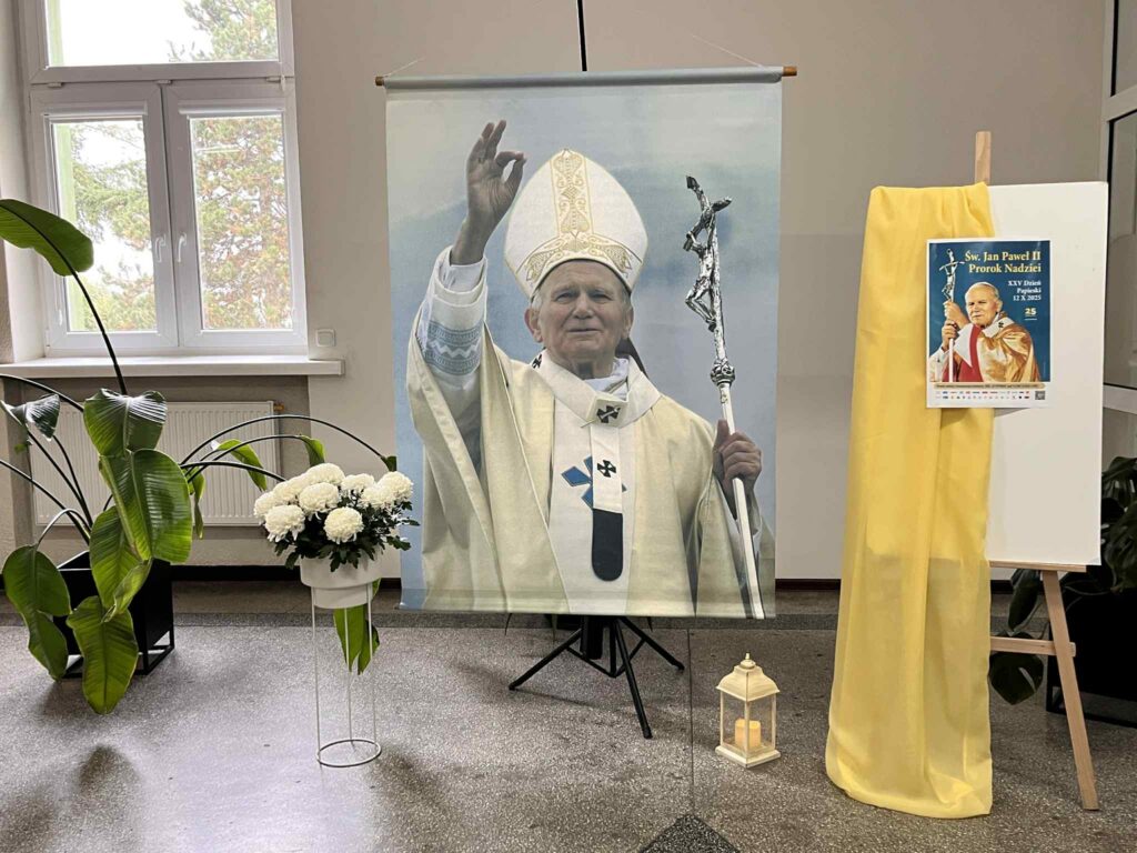 XXV Dzień Papieski w naszej szkole odbył się w dniu 16 października, w dniu kolejnej rocznicy wyboru Karola Wojtyły na Papieża. Z tej to okazji na dolnym korytarzu stanęła okolicznościowa dekoracja przygotowana przez p. Agnieszkę Kowalczyk. W klasach odbyły się katechezy związane z tegorocznym hasłem :”Jan Paweł II – Prorok nadziei”. Młodzież odkrywała na nich, że nadzieja nie jest w żadnym razie „matką głupich”, jak często obraźliwie się o niej mówi. Przeciwnie: jest matką mądrych, siostrą wiary i miłości. Nadzieja chrześcijańska to coś więcej, to wewnętrzna postawa serca, głębokie przekonanie, że życie człowieka budowane w jedności z Chrystusem ma sens, nawet wtedy, gdy jest trudno.